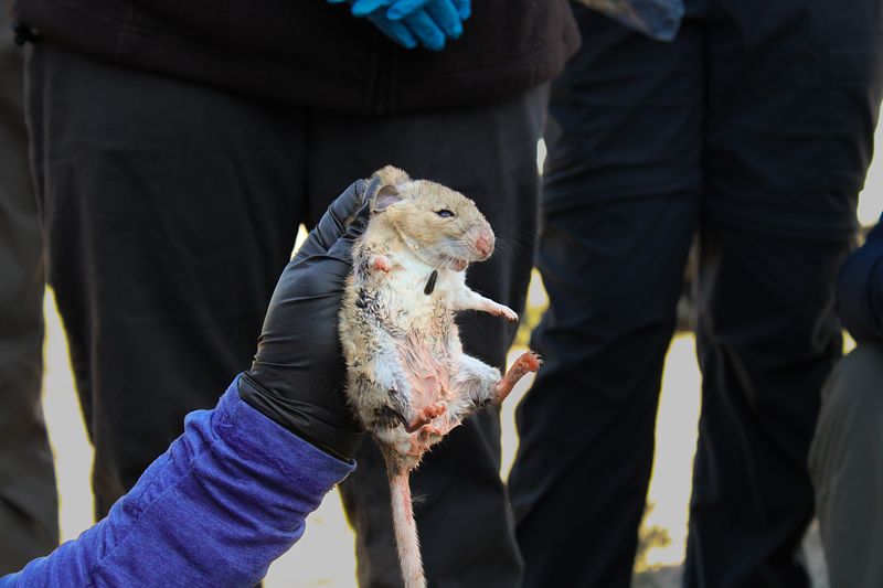 Releasing a kangaroo rat from a Sherman trap